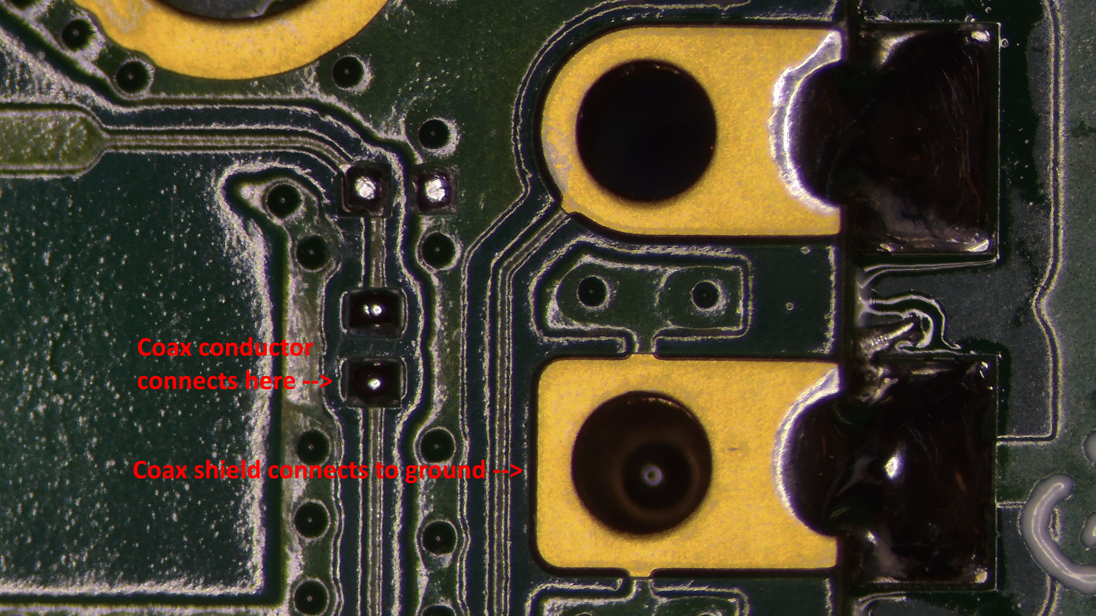 I started by soldering the coax shield wire to a nearby ground pad to anchor the pigtail and reduce stress on the R86 pad. I used kapton tape to help secure the cable to the PCB, minimizing the risk of accidental pad damage. Finally, I soldered the coax inner conductor to the R86 pad closest to the Wi-Fi can.